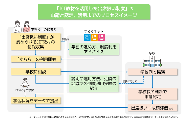 すららネットでは、ICT教材「すらら」を活用した出席扱い制度の利用について、マルチチャネル展開による知見を活かして、保護者側、学校側の双方をサポートしています。