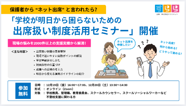 そこですららネットは、教員・教育委員会・支援者向けに「保護者から “ネット出席”と言われたら? 学校が明日から困らないための出席扱い制度セミナー」を開催します。
