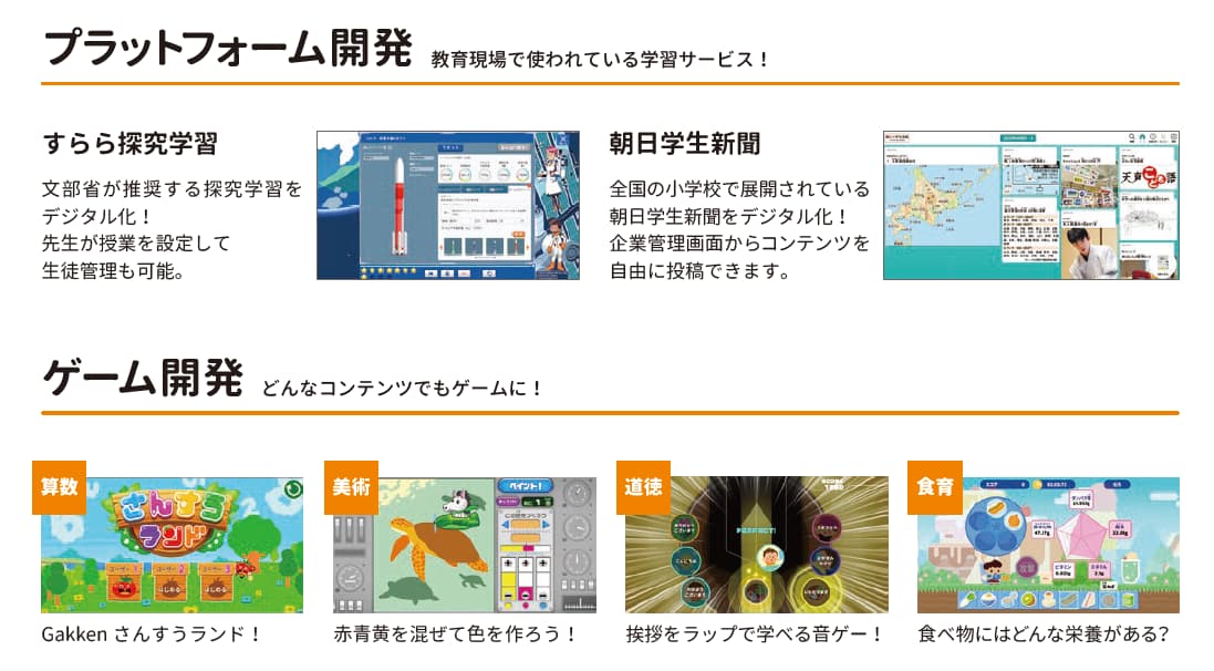 各種プラットフォーム開発や、ご依頼のニーズに合わせた企業向け「教育」をテーマにした幅広いサービスの受託開発を行っております。